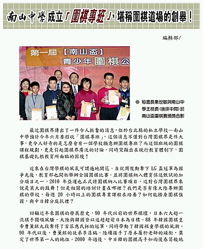 欣聞台北縣南山中學即將成立”圍棋專班”,台灣終於在圍棋專業教育上,向前邁向第一步,值得喝采!對於那些學棋,又不想放棄學業的孩子,無非是一大福音,可以有一條新的路和選擇!